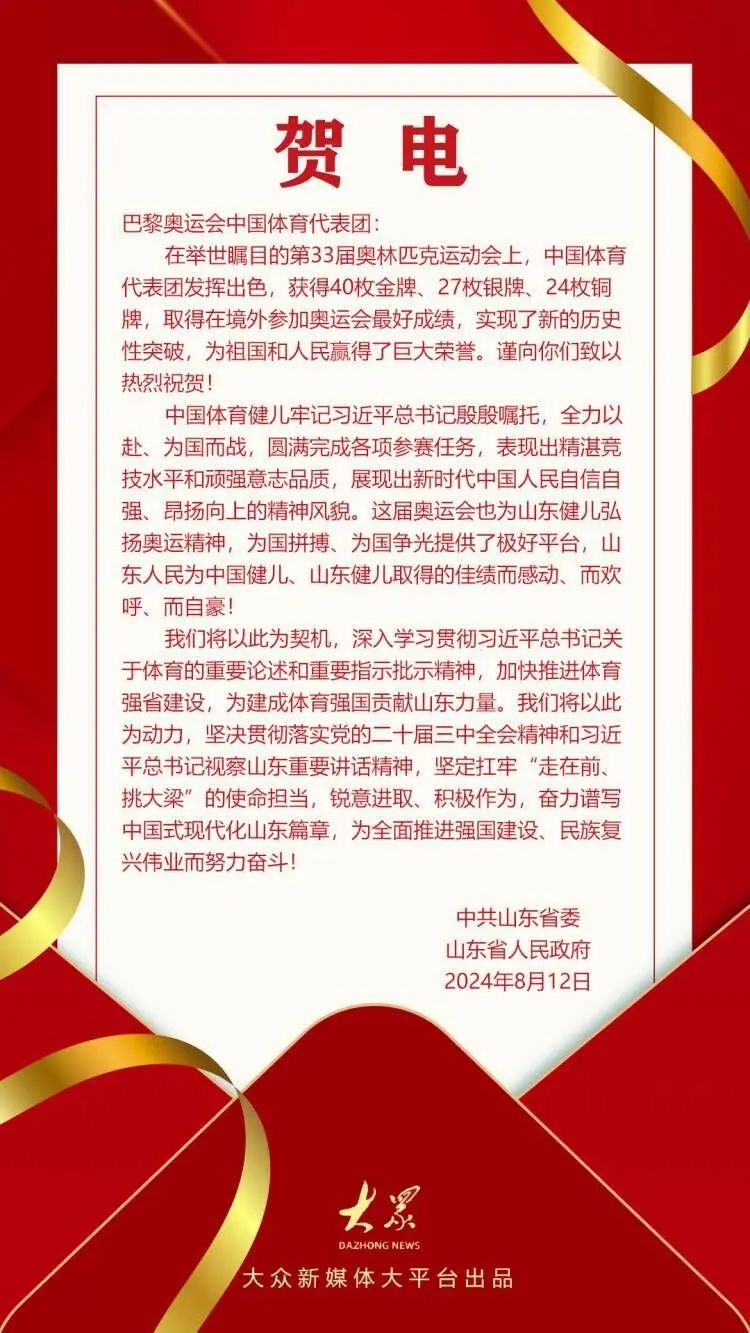 8月12日,山東省委、省政府向巴黎奧運會中國體育代表團致賀電。