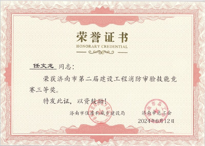 7月12日,由濟南市住房和城鄉建設局、濟南市總工會主辦的濟南市第二屆建設工程消防審驗技能競賽舉行了頒獎儀式,省醫工院員工任文龍榮獲競賽個人三等獎。