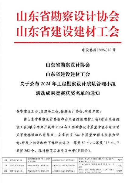 8月26日,山東省勘察設計協會和山東省建設建材工會聯合舉辦的“2024年工程勘察設計質量管理小組活動成果競賽”獲獎名單公布,省醫工院提報的3項成果全部榜上有名,喜獲一等獎1項、二等獎1項、三等獎1項。