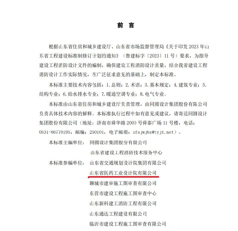 山東省醫工院作為國內最資深和全面的醫藥工程專業服務商之一,深度參與了這一重要標準的起草與修訂工作,為構建建設工程的標準化藍圖貢獻了智慧與力量。作為參編單位,山東省醫工院在標準制定的過程中,多次參與線上線下討論,及時提供相關技術信息,確保標準能夠緊密貼合行業需求,積極指導企業提高建設工程消防設計文件編制質量。