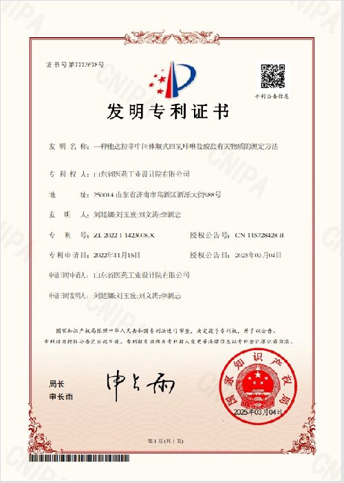 近日,山東省醫(yī)工院自主研發(fā)的“一種他達拉非中間體順式四氫咔啉鹽酸鹽有關物質的測定方法”獲國家知識產(chǎn)權局發(fā)明專利授權。